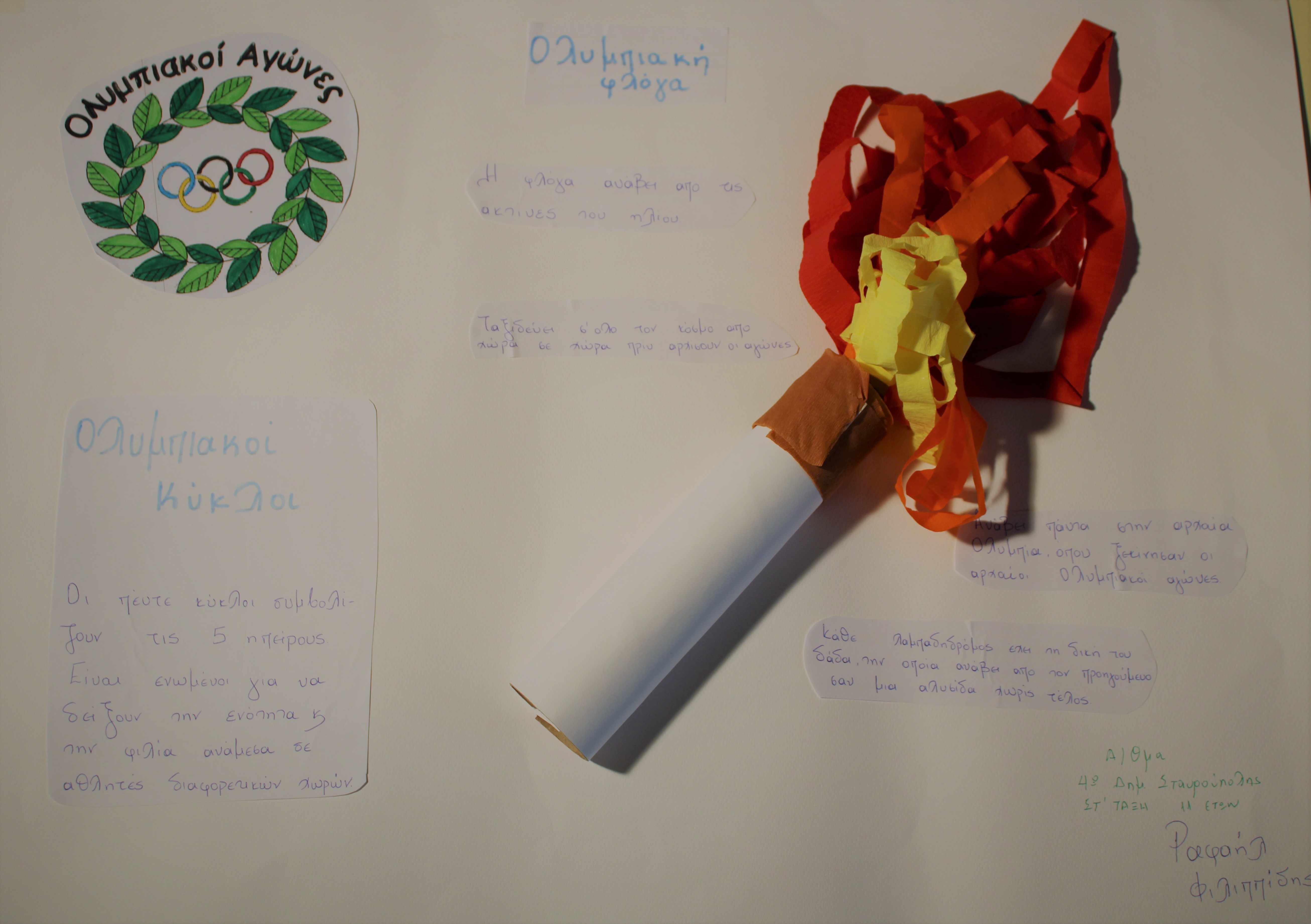 Το σχολείο μας για ακόμα μία χρονιά συμμετείχε στην Ολυμπιακή εβδομάδα με αθλητικές δραστηριότητες. Την Δευτέρα 16/5 υποδεχθήκαμε στο σχολείο αθλητές TAEKWONDO με διεθνείς διακρίσεις υπό την αιγίδα του ΤΕΦΑΑ Σερρών και του υπεύθυνου καθηγητή κ. Κομσή Γιώργου. Την Τετάρτη 18/5 συνδεθήκαμε με την ΕΘΝΟΑ και παρακολουθήσαμε εικονική περιήγηση του χώρου της αρχαίας Ολυμπίας και του μουσείου. Τα παιδιά συνομίλησαν διαδικτυακά με την παγκόσμια πρωταθλήτρια της ξιφομαχίας Δώρα Γκουντουρά. Επίσης συμμετείχανε στο καλλιτεχνικό εργαστήρι με ζωγραφικά έργα και κατασκευές. Δημιουργήσανε ακόμα και ένα βιντεάκι που εξυμνεί την ολυμπιακή φιλία με ήρωες από πλαστελίνη